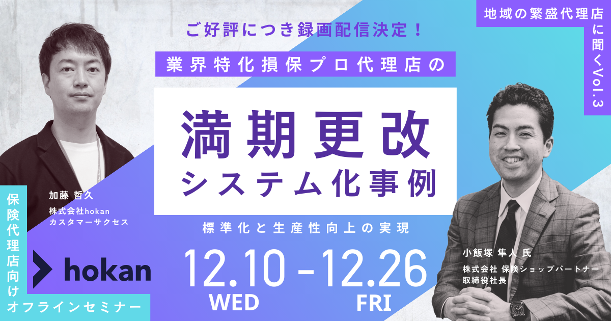 【視聴可能期間:25/12/26(金)まで】【2025年人気セミナー3選!】地域の繁盛代理店に聞く!vol.3 業界特化損保プロ代理店の満期更改システム化事例