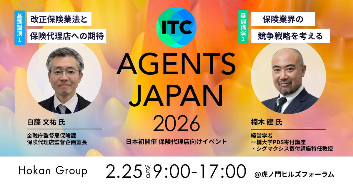 少子高齢化、異業種の参入、そして改正保険業法への対応 ——。 保険代理店経営は今、大きな変革の岐路に立たされています。2026年2月25日、虎ノ門ヒルズにて日本初開催となる「ITC Agents Japan」は、 まさに「これからの代理店経営の答え」を、世界の成功事例から見つけ出す、代理店経営者・幹部のためのグローバルカンファレンスです 。