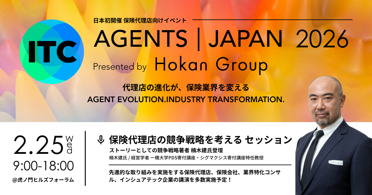少子高齢化、異業種の参入、そして改正保険業法への対応 ——。 保険代理店経営は今、大きな変革の岐路に立たされています。2026年2月25日、虎ノ門ヒルズにて日本初開催となる「ITC Agents Japan」は、 まさに「これからの代理店経営の答え」を、世界の成功事例から見つけ出す、代理店経営者・幹部のためのグローバルカンファレンスです 。
