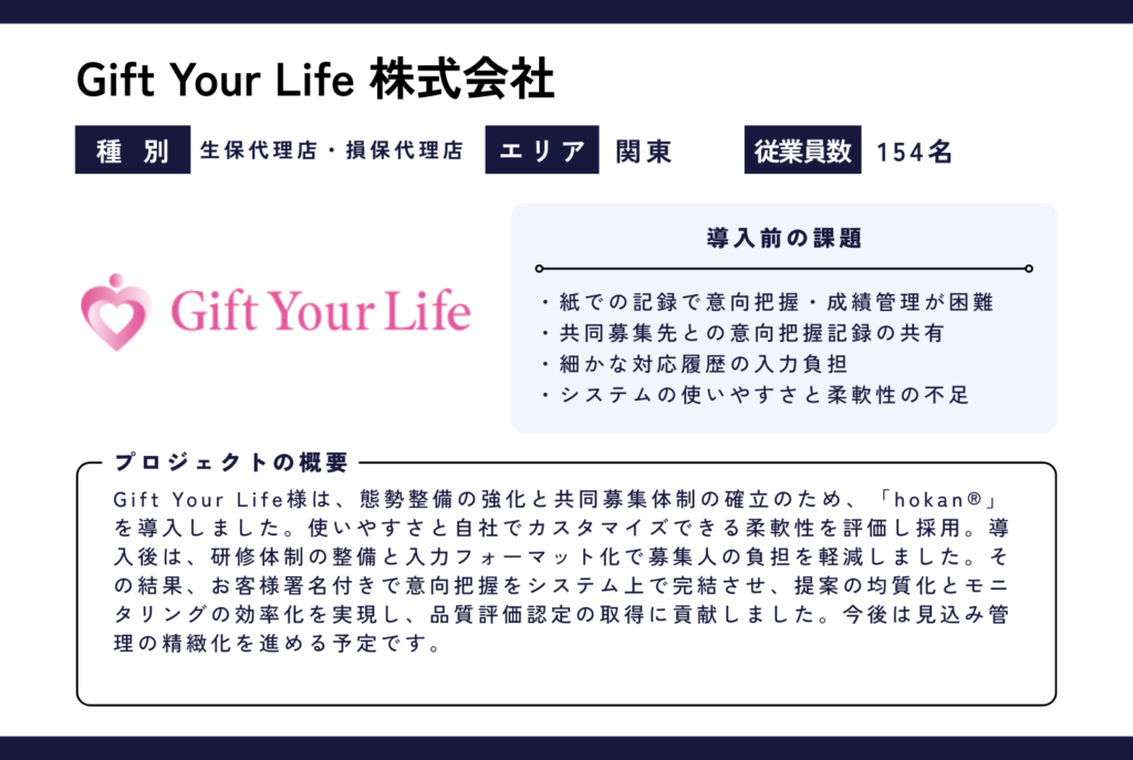 Gift Your Life様は生保メインの乗合保険代理店で、「hokan®︎」を積極的にご活用されています。システム活用においては導入から定着まで、この度インタビューを引き受けていただいた細田様が管理者となり、多くの工夫点やステップを踏んでお取り組みをされていらっしゃいます。今回は、「hokan®︎」導入の経緯やその後の活用状況について伺いました。