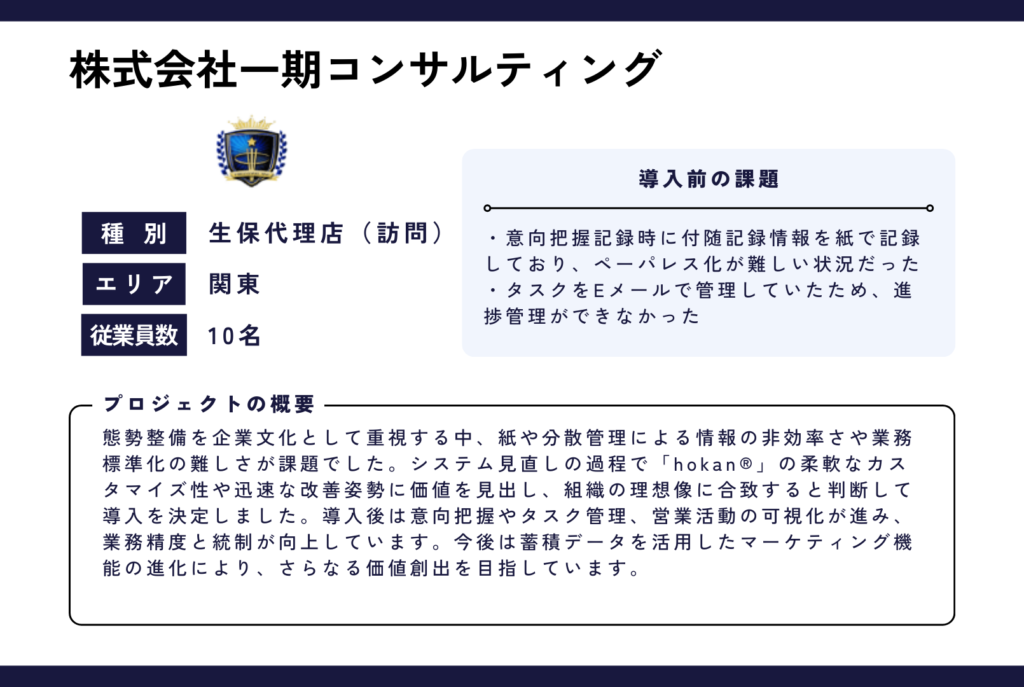 今回は、栃木県の生損保の代理店「株式会社一期コンサルティング」にインタビューをさせていただきました。態勢整備の取り組みやシステム選定の基準等が多くの保険代理店の参考になるかと存じます。ぜひご覧ください。