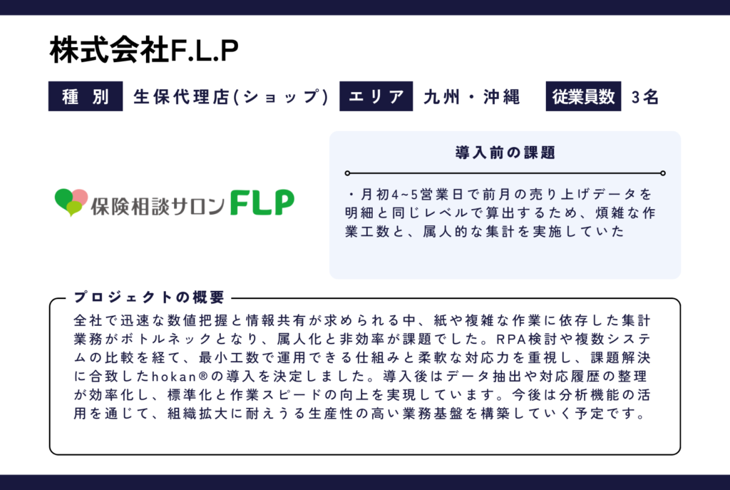 今回は、全国に店舗型の保険ショップ「保険相談サロンFLP」を展開している、「株式会社F.L.P」の中村様にインタビューをさせていただきました。