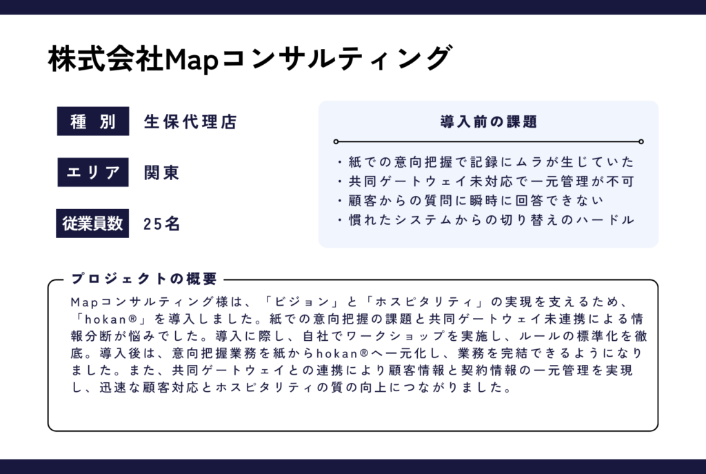 秋山社長; もともと課題に感じていた意向把握業務を最適化できたことが良かったですね。弊社では、意向把握を業務管理責任者に提出することを必須としているのですが、その流れをスムーズに実施することができるようになりました。意向把握業務においては紙を廃止し、一貫してhokan®で業務を遂行できています。 また、共同ゲートウェイとhokan®の連携も簡単にできるので、顧客情報と契約情報も一元管理できています。これまでは事務が電話を受けた際、該当する情報を調べるのも一苦労だったのですが、それもなくなり迅速な顧客対応をできるようになったので、ホスピタリティの質も向上したと思います。