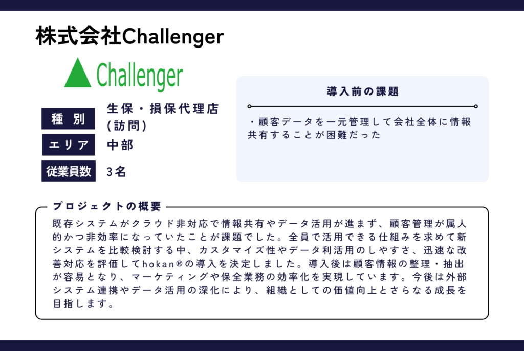 顧客管理システム「hokan®」のご利用をいただいている保険代理店様を対象に、hokan®を導入するにあたっての課題や背景、実際に利用してみての所感など、ありのままをお話いただくインタビューを実施しています。
