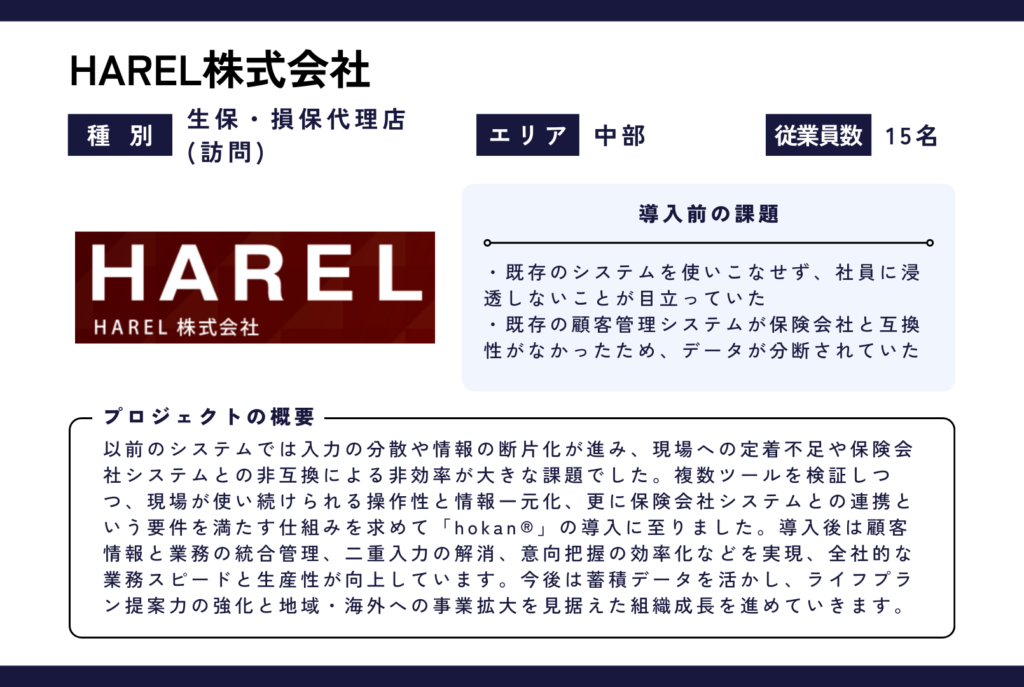 今回、静岡県浜松市を拠点に保険代理店業はもちろん、ライフプランのサービスを包括的に展開しているHAREL株式会社の代表取締役である小林様と、コンサルタントの水鳥様にお話を伺いました。保険代理店の垣根を越えて、お客様のライフプランに沿った多角的な提案をされているHAREL株式会社の取り組みや今後の展開に注目です。