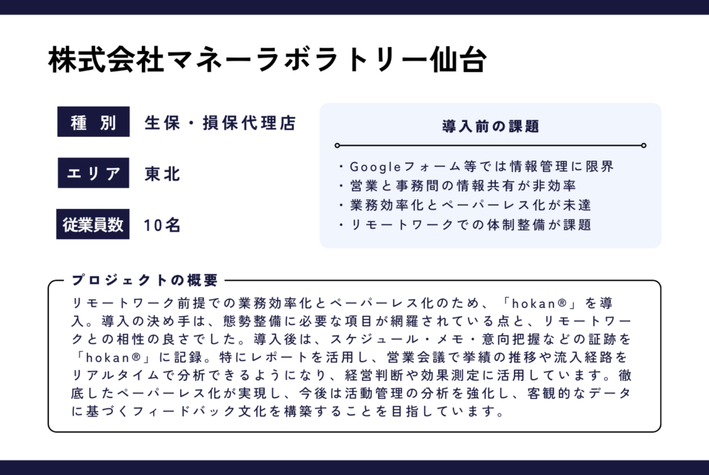 株式会社マネーラボラトリー仙台様は宮城県仙台市に拠点を置く住宅に特化した独立系FP会社です。お金にかかわる相談に幅広く対応しながら成長を続けられている代理店です。2022年2月から「hokan®︎」を本格的に活用いただいてから2年強で3名から10名まで急成長をされており、地方に拠点を置く代理店では少数派であるリモートワークを前提に運営をされています。