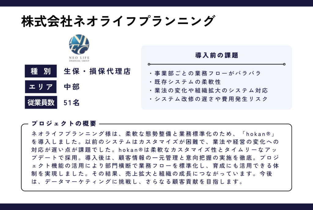 関西・東海エリアにてご活躍されている保険代理店、ネオライフプランニング様。今回は現在ご利用いただいている「hokan®︎」の導入背景や導入後の活用状況につき、取締役副社長の深谷様(写真右)、常務取締役の中村様(写真左)にお話を伺いました。