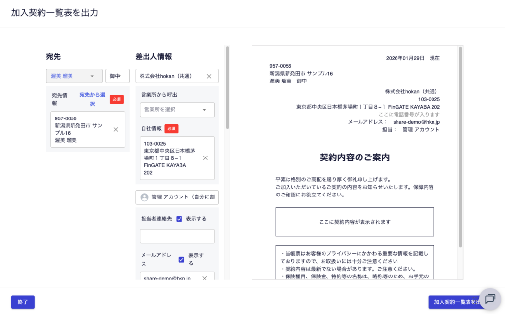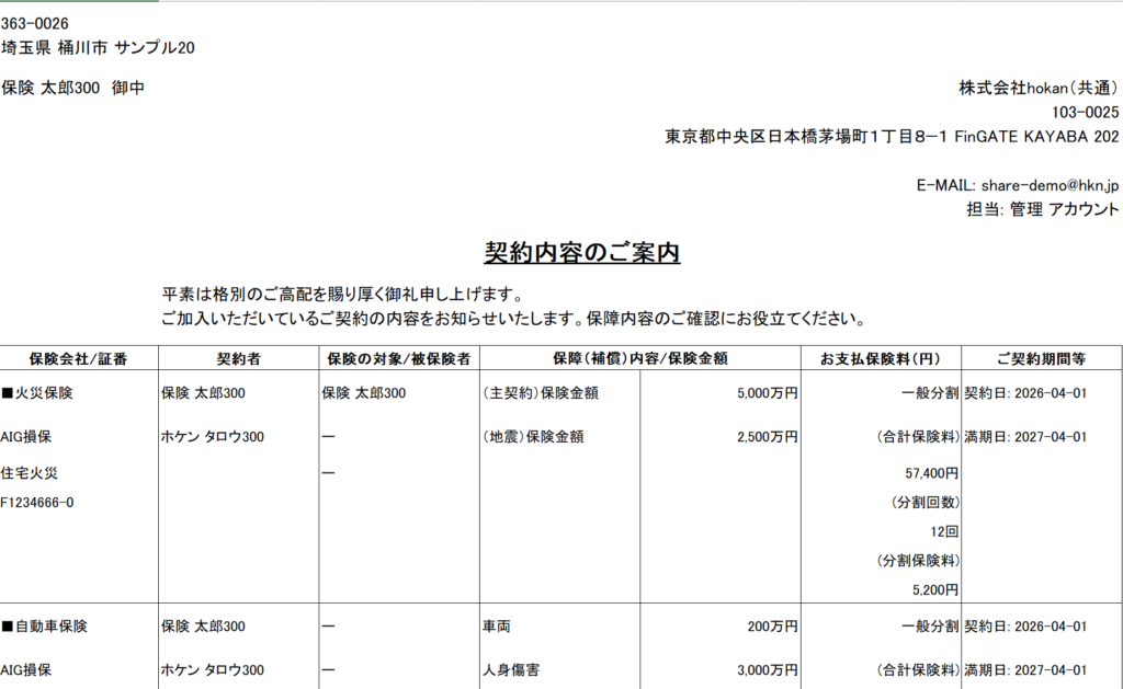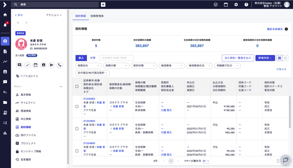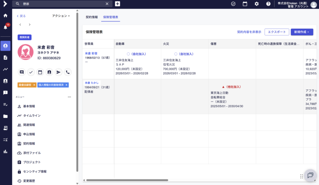 もしあの時、hokan®︎があれば: 顧客画面から契約一覧画面が確認でき、生損保問わず顧客に紐づいた契約が一覧で確認ができます。また、加入契約一覧表を出力することも可能なので、複数の保険会社にまたがる契約も即座に把握でき、お客様を待たせないスピード感が、プロとしての信頼をより強固にしていたはずです。