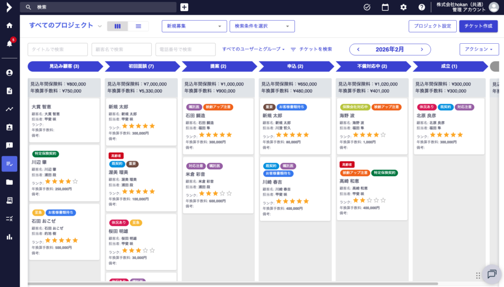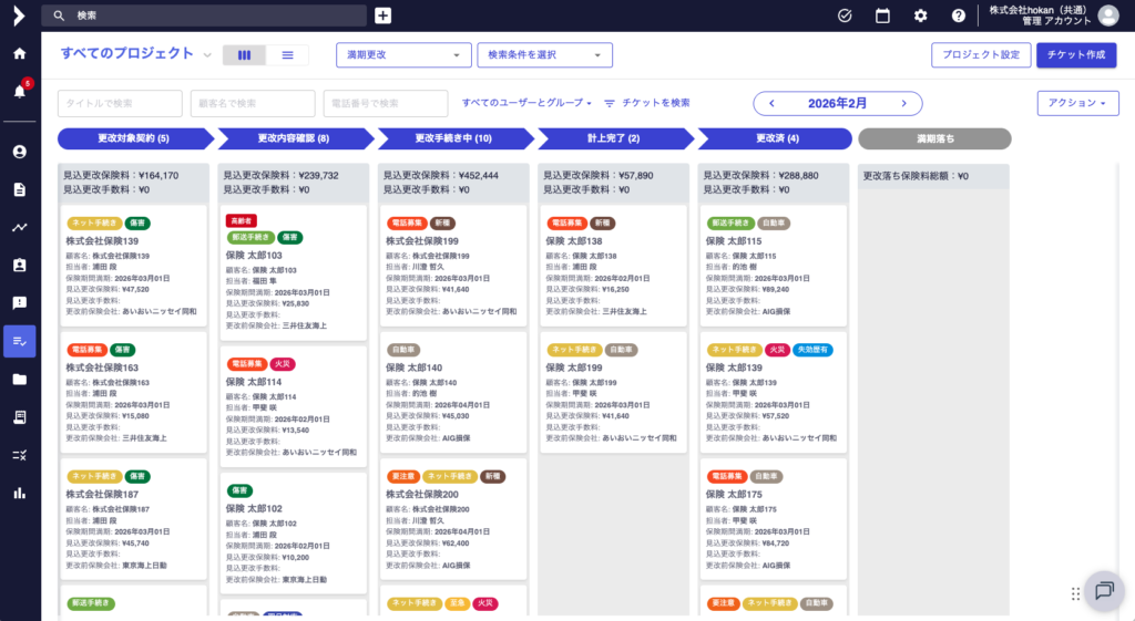 もしあの時、hokan®︎があれば: 案件管理機能の進捗を見るだけで、全案件の最新状況と見込み数字や満期更改の進捗が即座に把握できます。会議は「確認」ではなく「具体的な戦略」を練る場に変わっていたでしょう。