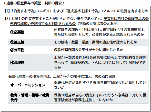 損保協会のガイドラインは、監督指針における過度の便宜供与の判断要素である「当該便宜供与の趣旨・目的のほか、価格・数量・頻度・期間及びその負担者等を総合的に勘案しつつ、当該便宜供与によって生じ得る弊害の内容・程度を考慮し、社会通念に照らして妥当であるか」という部分を、「必要性・適正性・公平性・合理性」の四つに整理した点が特徴です。