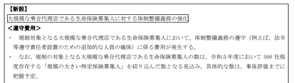 これは改正保険業法により特定大規模乗合損害保険代理店の業務運営に関する体制整備義務と同様の体制整備義務を大規模な乗合代理店である生命保険募集人に対して措置するものです。