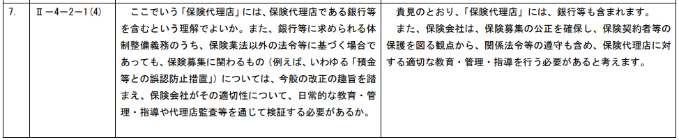 銀行窓販の弊害防止措置については、8月28日公表のパブリックコメントにおいて以下の回答がなされたこともあり、評価基準が網羅的な内容となるよう、代理店として確認が必要な事項として追加されるということかと思われます。