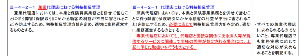 利益相反管理に関する部分が、これまでは「(他業との間に利益相反が生じ得る兼業代理店や、紹介料を受領するケースがある代理店の場合)利益相反管理態勢を構築し、過大な保険金請求に繋がるような行為を防止しているか。」とされており、 兼業代理店を念頭に置いていましたが、今後は専属代理店も、金融事業者としての顧客本位の業務運営の原則に則り、業務の実態に応じた措置が必要となります。
