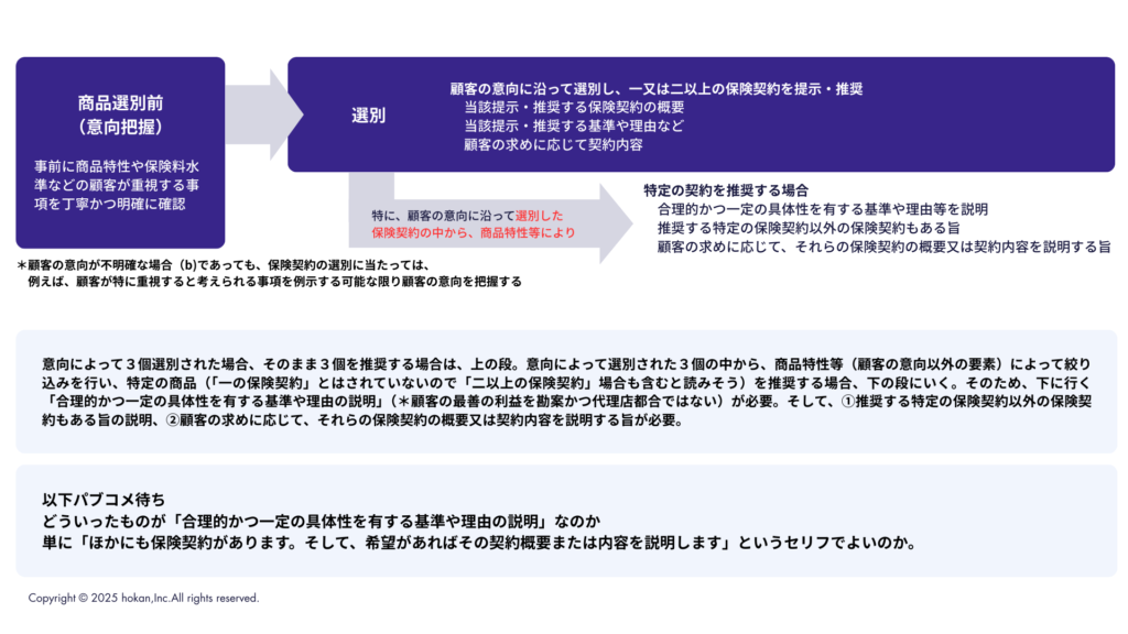 - 非常に重要なのは、商品特性等により、特定の保険契約を推奨する場合に①『推奨する特定の保険契約以外の保険契約もある旨』及び②『顧客の求めに応じて、それらの保険契約の概要又は契約内容を説明する旨』を説明しているか、とされた点と思われます。これは、顧客からの求めがなくとも、①推奨する特定の保険契約以外の保険契約もある旨②求めに応じてその契約概要と内容を説明する旨を説明する必要があると読めるからです。