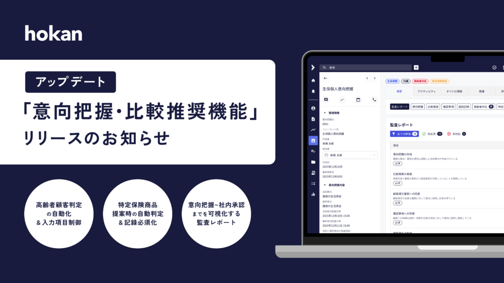 「適正な営業活動」と「組織のガバナンス強化」を支援するクラウド型保険代理店システム「hokan®︎」を提供する株式会社hokan(ホカン、本社:東京都中央区、代表取締役:横塚 出、以下:当社)は、このたび「意向把握・比較推奨機能」において大幅なアップデートを実施したことをお知らせいたします。