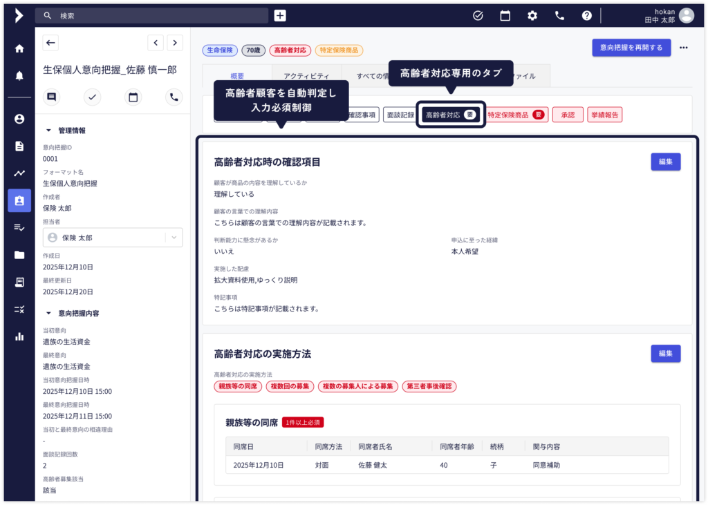 顧客年齢から高齢者を自動判定し、業法対応で求められる「高齢者対応記録項目」を自動表示・必須化。記録漏れ防止とガバナンス強化を支援します。