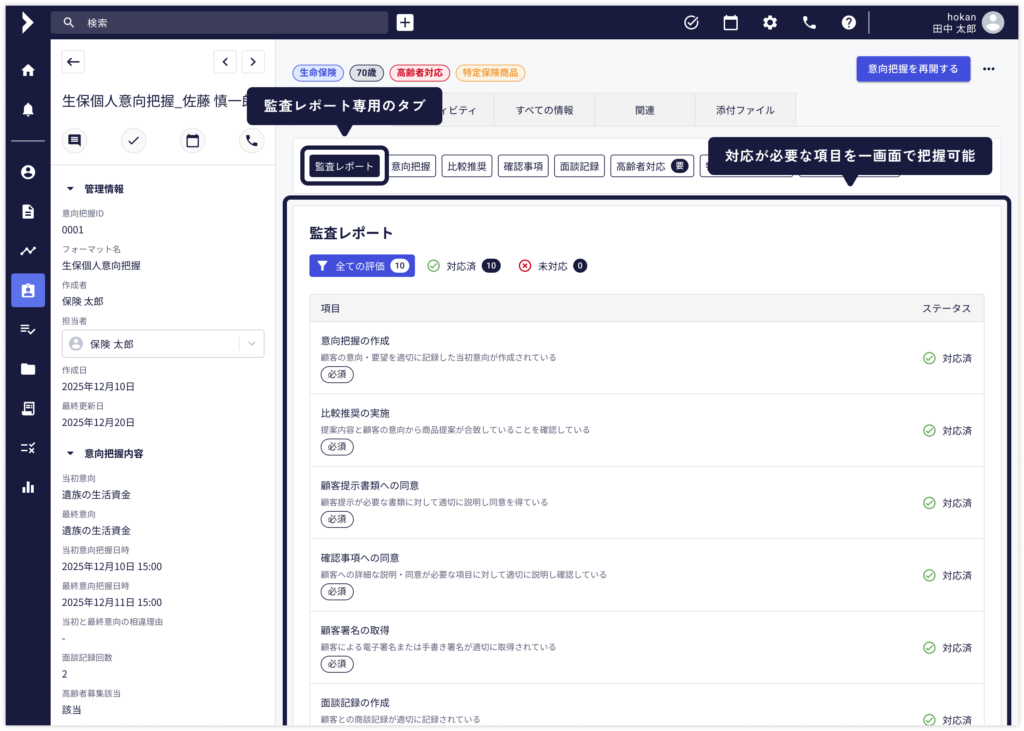 意向把握、比較推奨、特定保険商品記録、同意取得、承認履歴まで、全プロセスを一画面で確認可能。監査・点検対応を大幅に効率化します。