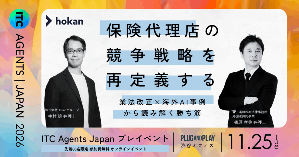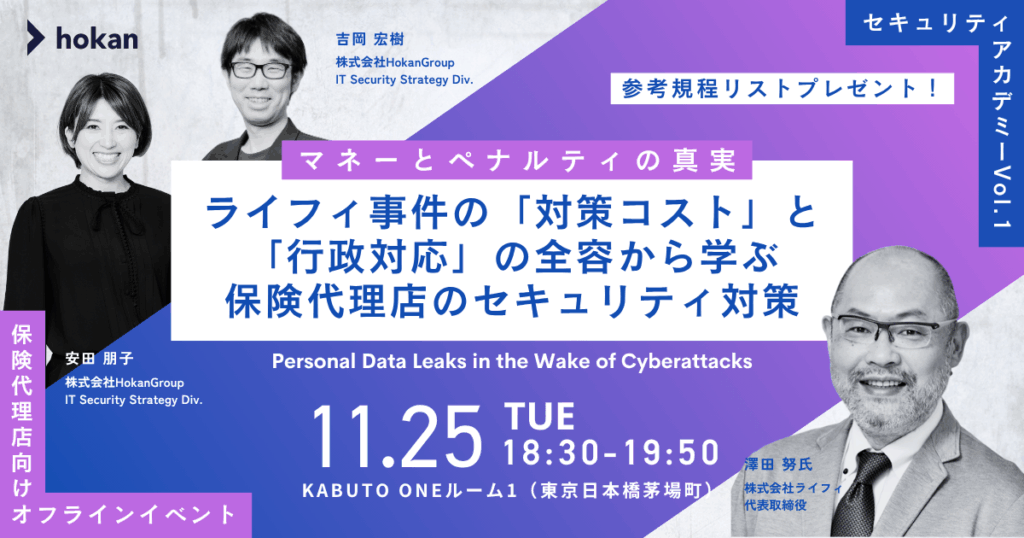 hokan主催のセミナー・イベント一覧 現在参加可能なセミナー一覧になります。 期限が迫っているものもございますので、お時間が許せばぜひ参加の御検討くださいますと幸いです。 先着60名限定! 【25/11/25(火) 17時〜20時 オフラインイベント】ITC Agents Japan開催プレイベント 「保険代理店の競争戦略を再定義する」 ー業法改正×海外AI事例から読み解く勝ち筋ー 【25/11/25(火) 18:30~19:50 オフラインイベント】マネーとペナルティの真実:ライフィ事件の「対策コスト」と「行政対応」の全容から学ぶ、保険代理店のセキュリティ対策 【25/10/31 オンラインセミナー】もうExcelと紙には戻れない!hokan 出納で精算業務をアップデート 【YouTubeで公開中!】保険の仕事人 THE INSURANCE SPECIALIST 〜業界の最前線から〜 Ep1 株式会社保険見直し本舗 【終了済み】【25/10/22 オンラインセミナー】改正保険業法に備える!IT補助金で低コストの顧客管理システム導入を支援 【終了済み】【25/9/30 オンラインセミナー】一緒に読み解くパブリックコメントvol.2 どこよりもわかりやすく徹底解説 【終了済み】【25/09/25 オンラインセミナー】【改訂方針案解説付き】損保協会自己点検シートから考えるシステム活用 【終了済み】【25/9/12 オンラインセミナー】一緒に読み解くパブリックコメントvol.1 どこよりもわかりやすく徹底解説 【終了済み】【25/9/3 オンラインセミナー】オリックス生命のDX成功事例から学ぶ、hokan導入の決め手と効果 【終了済み】【25/8/20(水) 17時〜18時30分 オフラインイベント】保険業界の第一線を担う弁護士が集結する座談会第2回 保険業法改正とそのインパクトを語る 1 2 3 … 5 Next »