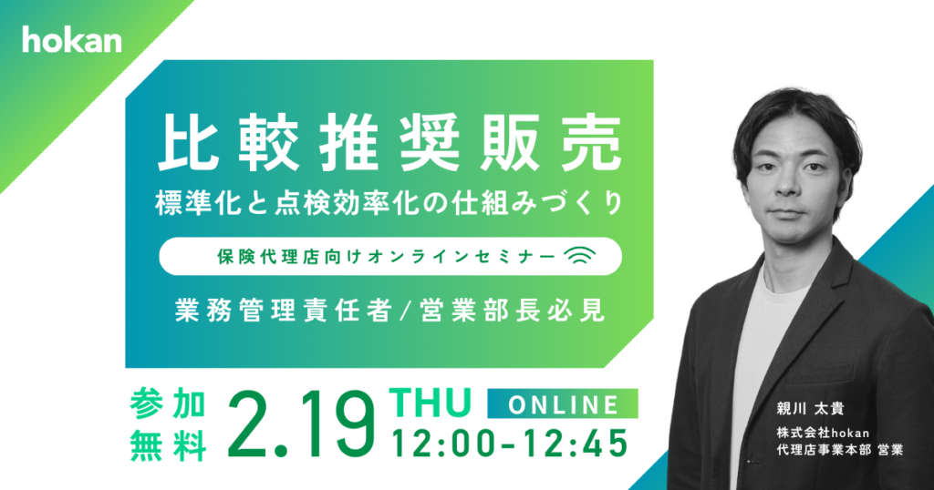 hokan主催のセミナー・イベント一覧 現在参加可能なセミナー一覧になります。 期限が迫っているものもございますので、お時間が許せばぜひ参加の御検討くださいますと幸いです。 【26/2/6(金) 16時〜18時 オフラインイベント】保険業界の第一線を担う弁護士が集結する座談会第3回 「保険業法改正とハ方式廃止の全貌を語る」 【26/2/19(木) 12時〜12時45分 オンラインセミナー】『比較推奨販売』標準化と点検効率化の仕組みづくり 日本初開催【26/2/25(水) 9時〜17時 オフラインイベント】保険代理店経営者・幹部向け世界最大級のInsurTechカンファレンス、日本初上陸!ITC AGENTS JAPAN 2026 【終了済み】【26/1/26(月) 12時〜12時30分 オンラインセミナー】「保険業法改正0.5」出版記念セミナー 〜監督指針解説付き〜 【YouTubeで公開中!】保険の仕事人 THE INSURANCE SPECIALIST 〜業界の最前線から〜 Ep1 株式会社保険見直し本舗 【終了済み】【25/12/24(水) 12時〜12時30分 オンラインセミナー】一緒に読み解く監督指針改正案 比較推奨販売 どこよりも早く徹底解説 【終了済み】【関西エリア保険代理店様限定 オフラインイベント】12/18(木) 14時〜16時30分 「弁護士解説」保険代理店のための「次の一手」発見セミナー DX・態勢整備・比較推奨の『今』がわかる 【終了済み】25/11/25(火) 17時〜20時 オフラインイベント ITC Agents Japan開催プレイベント 「保険代理店の競争戦略を再定義する」 ー業法改正×海外AI事例から読み解く勝ち筋ー 【終了済み】【25/10/31 オンラインセミナー】もうExcelと紙には戻れない!hokan 出納で精算業務をアップデート 【終了済み】【25/10/22 オンラインセミナー】改正保険業法に備える!IT補助金で低コストの顧客管理システム導入を支援 1 2 3 … 5 Next »