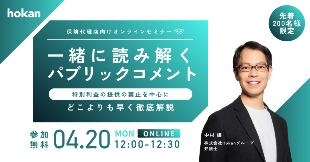 hokan主催のセミナー・イベント一覧 現在参加可能なセミナー一覧になります。 期限が迫っているものもございますので、お時間が許せばぜひ参加の御検討くださいますと幸いです。 【26/4/20(月) 12時〜12時30分 オンラインセミナー】一緒に読み解くパブリックコメント どこよりも早く徹底解説! 【YouTubeで公開中!】保険の仕事人 THE INSURANCE SPECIALIST 〜業界の最前線から〜 Ep1 株式会社保険見直し本舗 【終了済み】【26/3/4(水) 12時〜13時 オンラインセミナー】Excel管理からの卒業→ 見える化で次のステージへ 目標設定・行動管理・実績集計 全て繋がるhokan活用術 【終了済み】日本初開催【26/2/25(水) 9時〜17時 オフラインイベント】保険代理店経営者・幹部向け世界最大級のInsurTechカンファレンス、日本初上陸!ITC AGENTS JAPAN 2026 【終了済み】【26/2/19(木) 12時〜12時45分 オンラインセミナー】『比較推奨販売』標準化と点検効率化の仕組みづくり 【終了済み】【26/2/6(金) 16時〜18時 オフラインイベント】保険業界の第一線を担う弁護士が集結する座談会第3回 「保険業法改正とハ方式廃止の全貌を語る」 【終了済み】【26/1/26(月) 12時〜12時30分 オンラインセミナー】「保険業法改正0.5」出版記念セミナー 〜監督指針解説付き〜 【終了済み】【25/12/24(水) 12時〜12時30分 オンラインセミナー】一緒に読み解く監督指針改正案 比較推奨販売 どこよりも早く徹底解説 【終了済み】【関西エリア保険代理店様限定 オフラインイベント】12/18(木) 14時〜16時30分 「弁護士解説」保険代理店のための「次の一手」発見セミナー DX・態勢整備・比較推奨の『今』がわかる 【終了済み】25/11/25(火) 17時〜20時 オフラインイベント ITC Agents Japan開催プレイベント 「保険代理店の競争戦略を再定義する」 ー業法改正×海外AI事例から読み解く勝ち筋ー 1 2 3 … 6 Next »